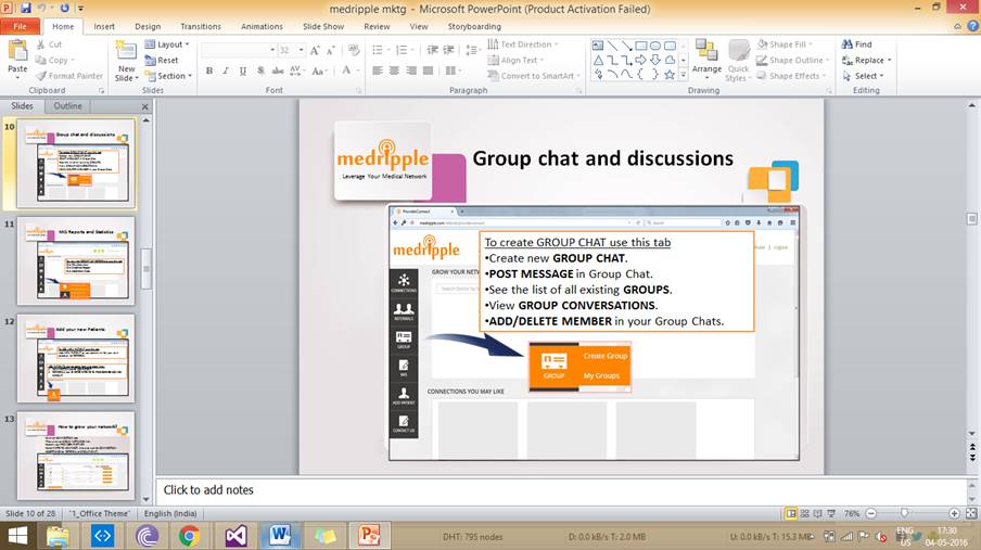 In this, doctor can make a group which helps in discussing the problem of a patient with another doctor. There are two types of groups one is the normal type where every group member can send the message and one is the announcement type where only the group admin can send the message.